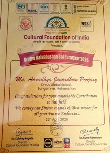 ಈ ವಿದ್ಯಾರ್ಥಿಗಳು ತಿಂಗಳ ನಿರಂತರ ಅಭ್ಯಾಸ, ಗಂಟೆಗಳ ಕಠಿಣ ಪರಿಶ್ರಮ ಮತ್ತು ಉತ್ತಮ ಮಾರ್ಗದರ್ಶನ, ಶಾಲೆಯ ನೃತ್ಯ ತರಬೇತು ದಾರರಾದ ಸೋನಾಲಿ ಮಹಾಪಾತ್ರ ಮತ್ತು ಗಂಧರ್ವ ಪಲೈ ಅವರ ಅಮೂಲ್ಯ ತರಬೇತಿ ಈ ಗೌರವಕ್ಕೆ ಕಾರಣವಾಗಿದೆ. ಈ ಪ್ರಶಸ್ತಿಗಳ ವಿತರಣೆಯು ಕಳೆದ ಭಾನುವಾರ (ಎ.೨೬) ನಾಗ್ಪುರದಲ್ಲಿ ನಡೆದ ಪ್ರಶಸ್ತಿ ಪ್ರಧಾನ ಸಮಾರಂಭದಲ್ಲಿ ಈ ಕಲಾವಿದರನ್ನು ಕಲಾ ಕ್ಷೇತ್ರದ ದಿಗ್ಗಜರು ಹಾಗೂ ಗಣ್ಯರ ಉಪಸ್ಧಿಯಲ್ಲಿ ಕಲ್ಚರಲ್ ಫೌಂಡೇಶನ್ನ ನಿರ್ದೇಶಕರುಗಳಾದ ಕುಲ್ದೀಪ್ ಕಗಡೆ ಮತ್ತು ಕುನಾಲ್ ಆನಂದಮ್ ಅವರು ಪ್ರಶಸ್ತಿ ಪತ್ರ, ಗೌರವ ಫಲಕ ಪ್ರದಾನಿಸಿ ಸನ್ಮಾನಿಸಿ ಅಭಿನಂದಿಸಿದರು.