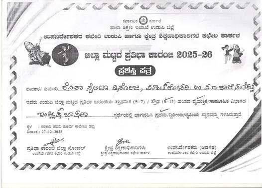 ಉಡುಪಿ: ಸರಕಾರಿ ಪದವಿ ಪೂರ್ವ ಕಾಲೇಜು ಹೆಬ್ರಿ ಇಲ್ಲಿ ನಡೆದ ಉಡುಪಿ ಜಿಲ್ಲ ಮಟ್ಟದ ಪ್ರತಿಭಾ ಕಾರಂಜಿ ೨೦೨೫-೨೬ ಪ್ರೌಢ ಶಾಲಾ ವಿಭಾಗದಲ್ಲಿ ಇಂಗ್ಲೀಷ್ ಭಾಷಣ ಸ್ಪರ್ಧೆಯಲ್ಲಿ ಸಂತೆಕಟ್ಟೆ ಮೌಂಟ್ ರೋಸರಿ ಆಂಗ್ಲ ಶಾಲೆಯ ಹತ್ತನೇ ತರಗತಿ ವಿದ್ಯಾರ್ಥಿನಿ ರೆನೀಶಾ ಸ್ಟಲಿಟಾ ಡಿಸೋಜ ಪ್ರಥಮ ಸ್ಥಾನ ಪಡೆದು ರಾಜ್ಯ ಮಟ್ಟಕ್ಕೆ ಆಯ್ಕೆಯಾಗಿರುತ್ತಾಳೆ.