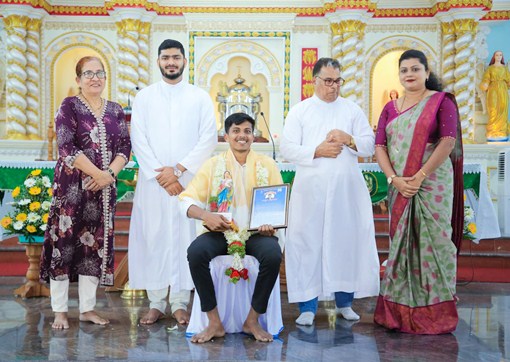 Santhekatte: It was a proud and joyous occasion for the parishioners of Mount Rosary Church, Santhekatte–Kallianpur, as one of their own — Mr. Godwin Mascarenhas, an energetic youth leader and promising entrepreneur — was felicitated for receiving the prestigious ‘Yuva Ratna’ Award, a Karnataka State-level recognition for his exemplary leadership and service to youth.The felicitation ceremony took place on Sunday, 12th October 2025, immediately after the 8:00 a.m. Holy Mass. Parish priest Rev. Dr. Roque D’Souza draped the traditional shawl, while Rev. Fr. Rohan Mascarenhas, Assistant Parish Priest, garlanded the honouree. Mrs. Priya Furtado, Secretary of the Parish Pastoral Council, read out the citation and presented the same to the awardee.